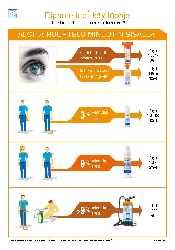 Kemikaalionnettomuuden jälkeen pysyvien vammojen syntymiseen kuluu usein vain muutamia sekunteja. Diphoterine® toimii välittömästi ja estää vaurioiden syntymisen neutraloimalla kemikaalin ennen kuin se aiheuttaa pysyviä vahinkoja.