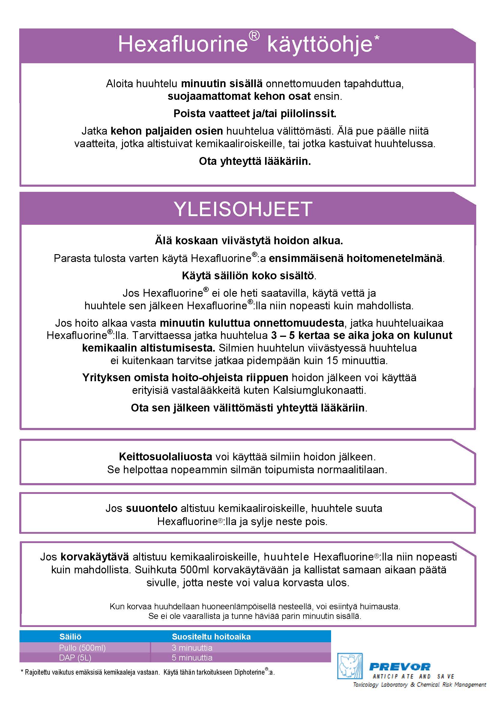 Seinään kiinnitettävä huuhteluasema sisältää 2 x 500 ml Hexafluorine® -pulloa. Sisältö on mukautettu neutraloimaan ja pesemään pois pieniä määriä fluorivetyhappoa koko kehosta, erityisesti kasvoilta ja silmiltä. Huuhtelu on aloitettava 60 sekunnin kuluessa kemikaalien roiskumisesta vahinkojen minimoimiseksi, joten sijoita huuhteluasema lähelle riskialuetta.